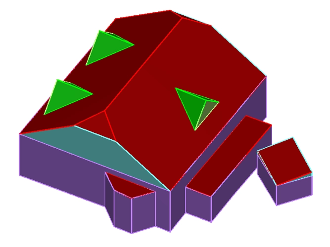 Die Laserscandaten werden automatisch segmentiert und Flächen gefunden, durch Verschneidung der einzelnen Flächen werden Dachmodelle abgeleitet: